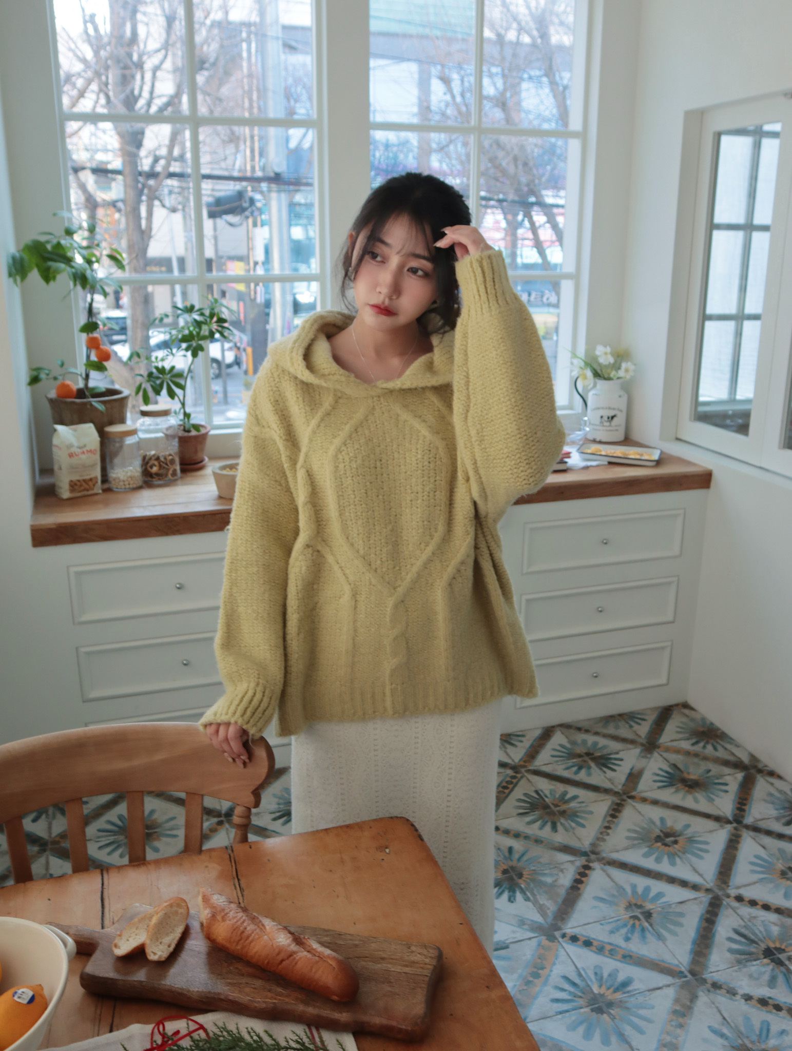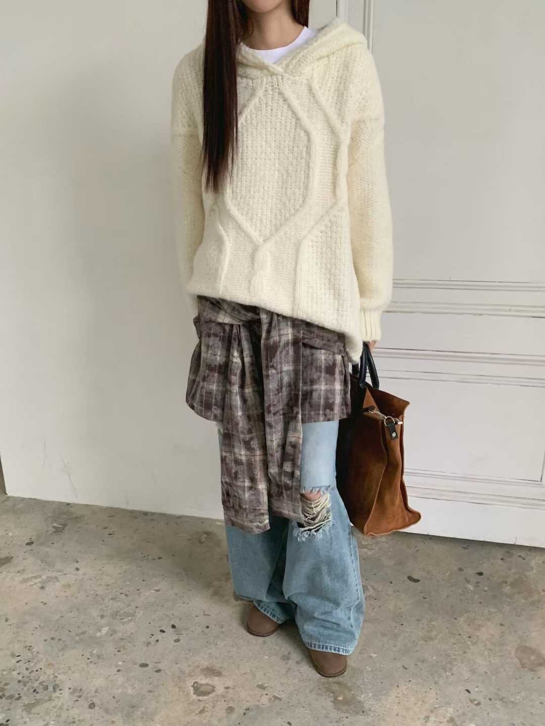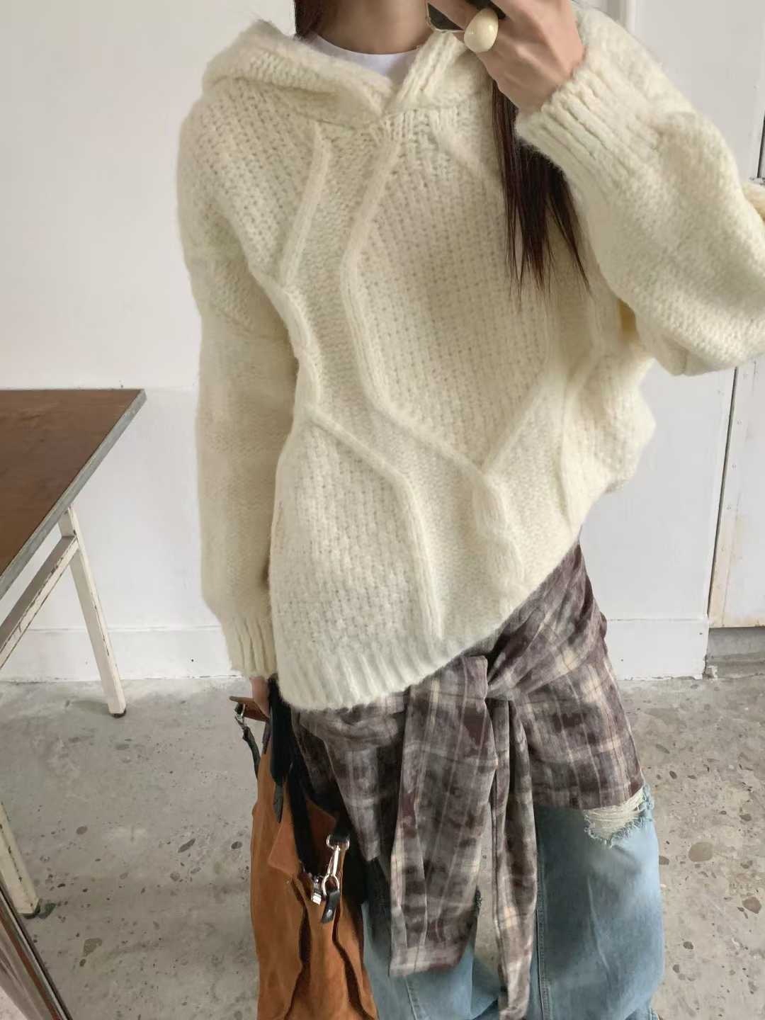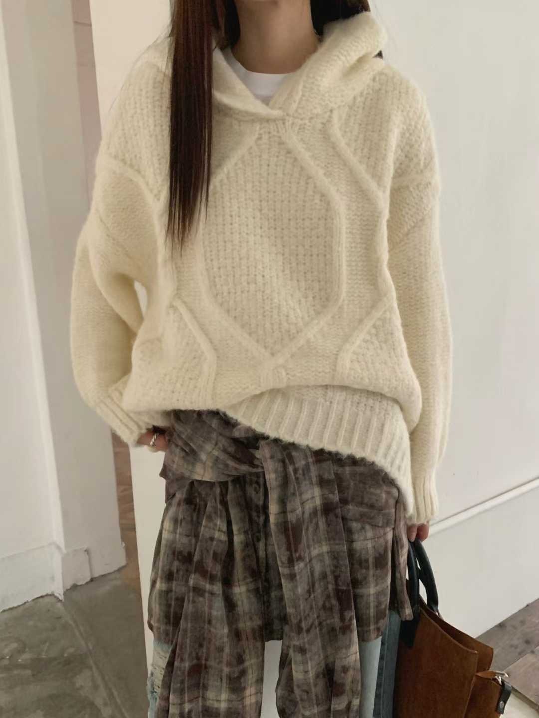 25K106 酪梨奶油 鬆鬆軟軟連帽麻花長板毛衣 (自留款)
