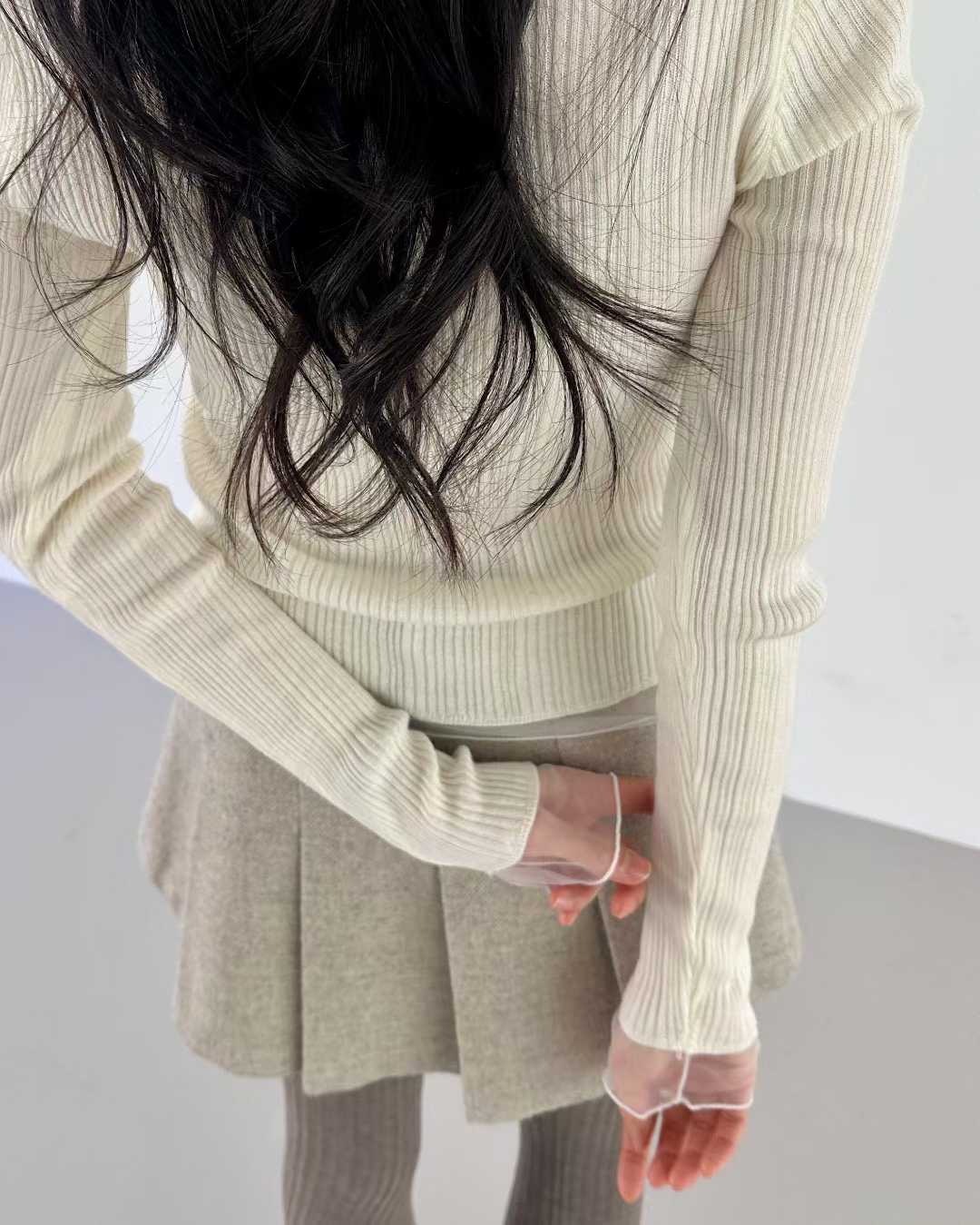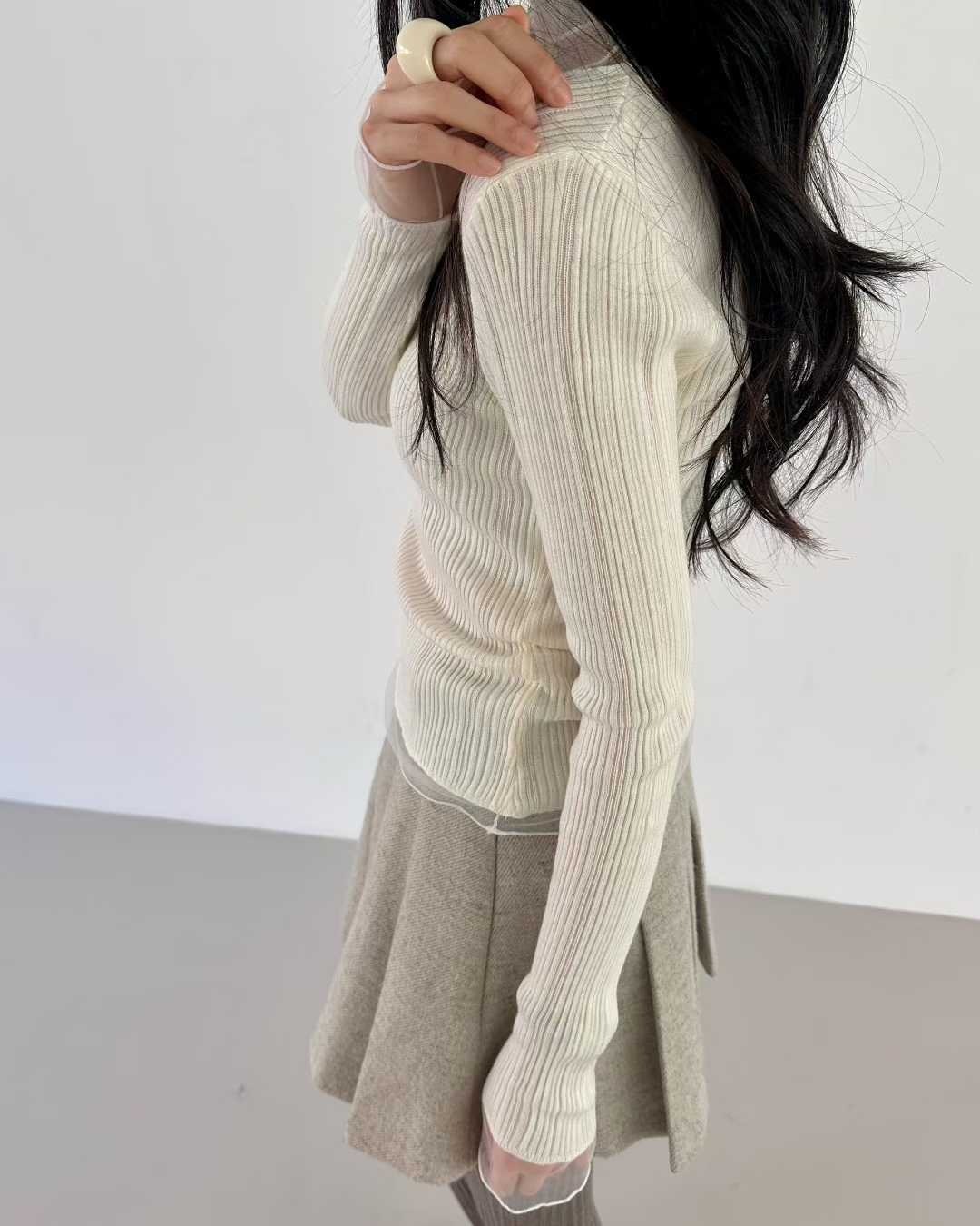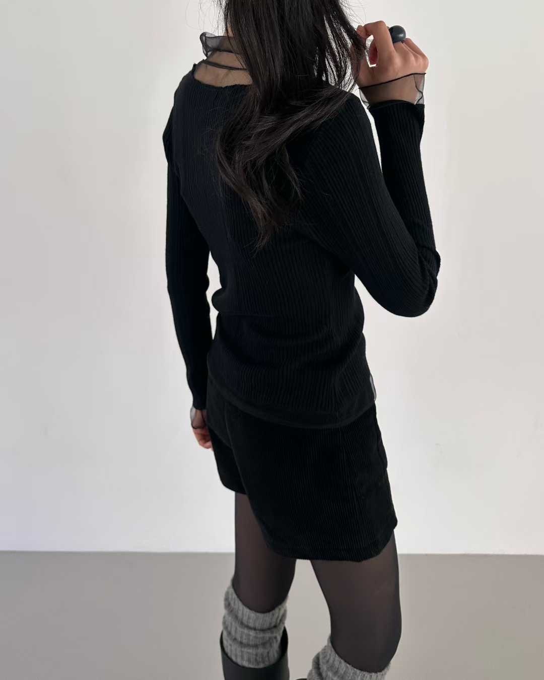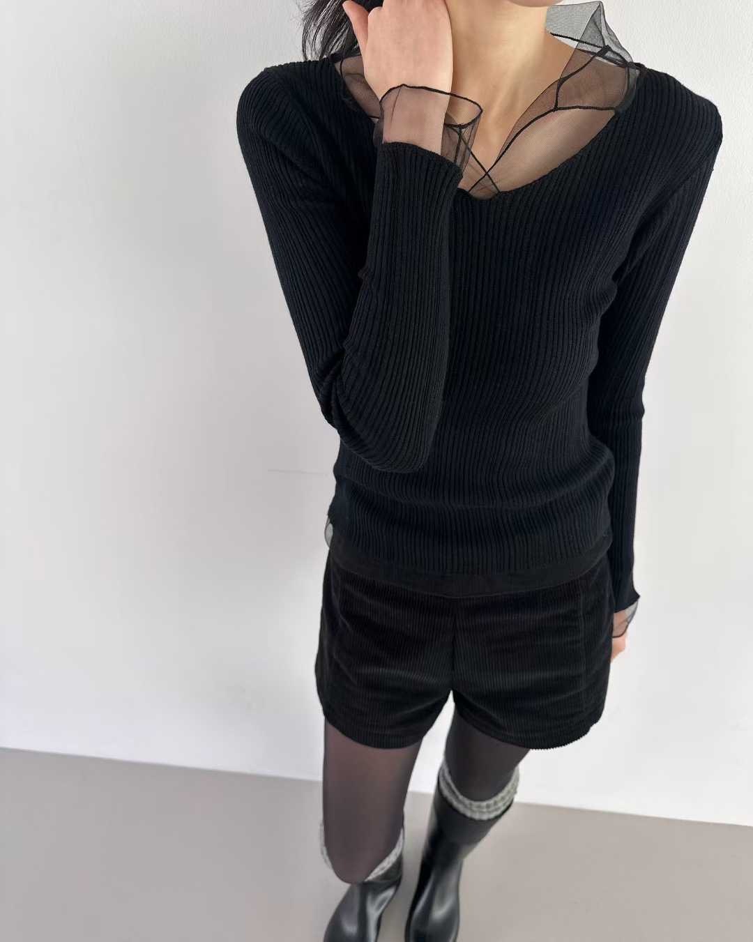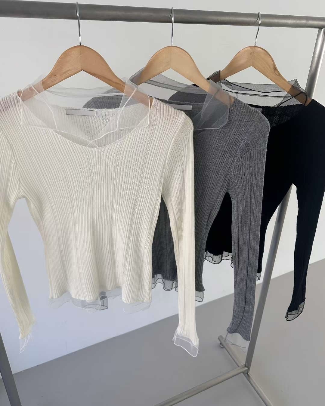 25K114 本期推薦! 清透質感透膚領拼紗坑條上衣
