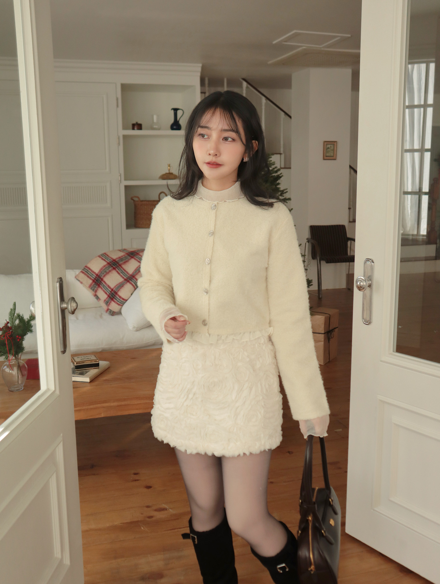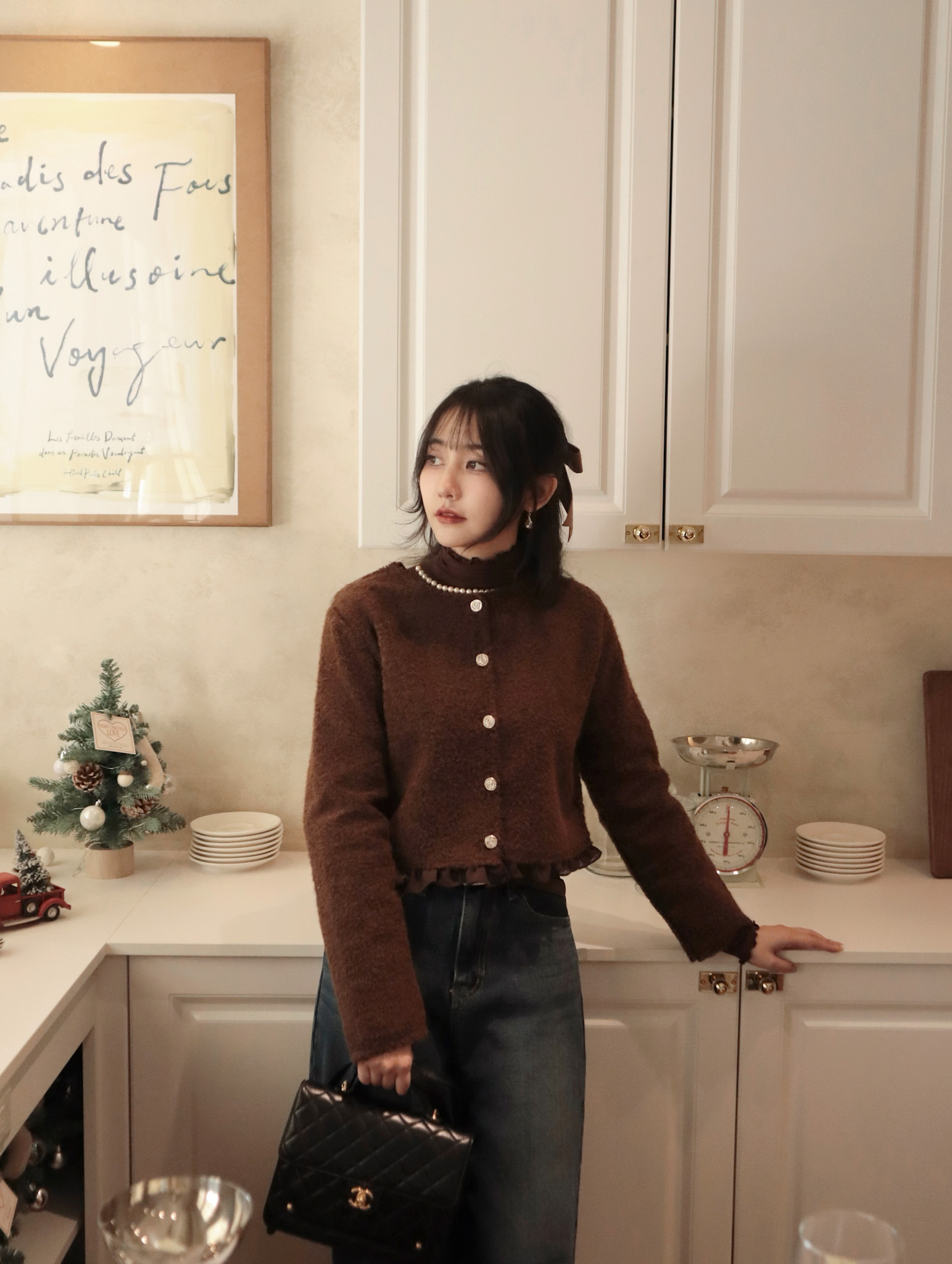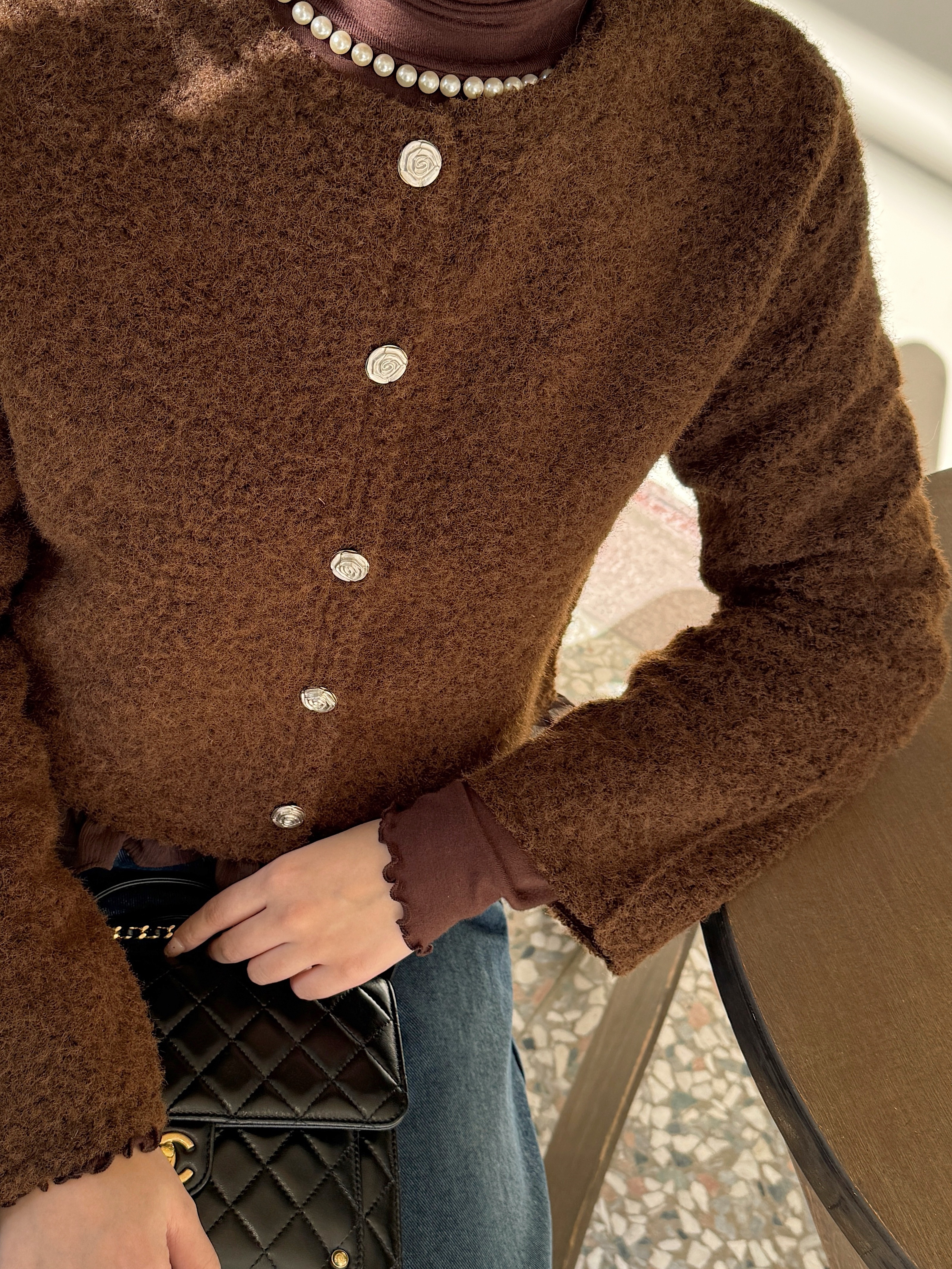 25K116 本期推薦!小香文藝復興 法式玫瑰釦木耳滾邊小外套/毛衣