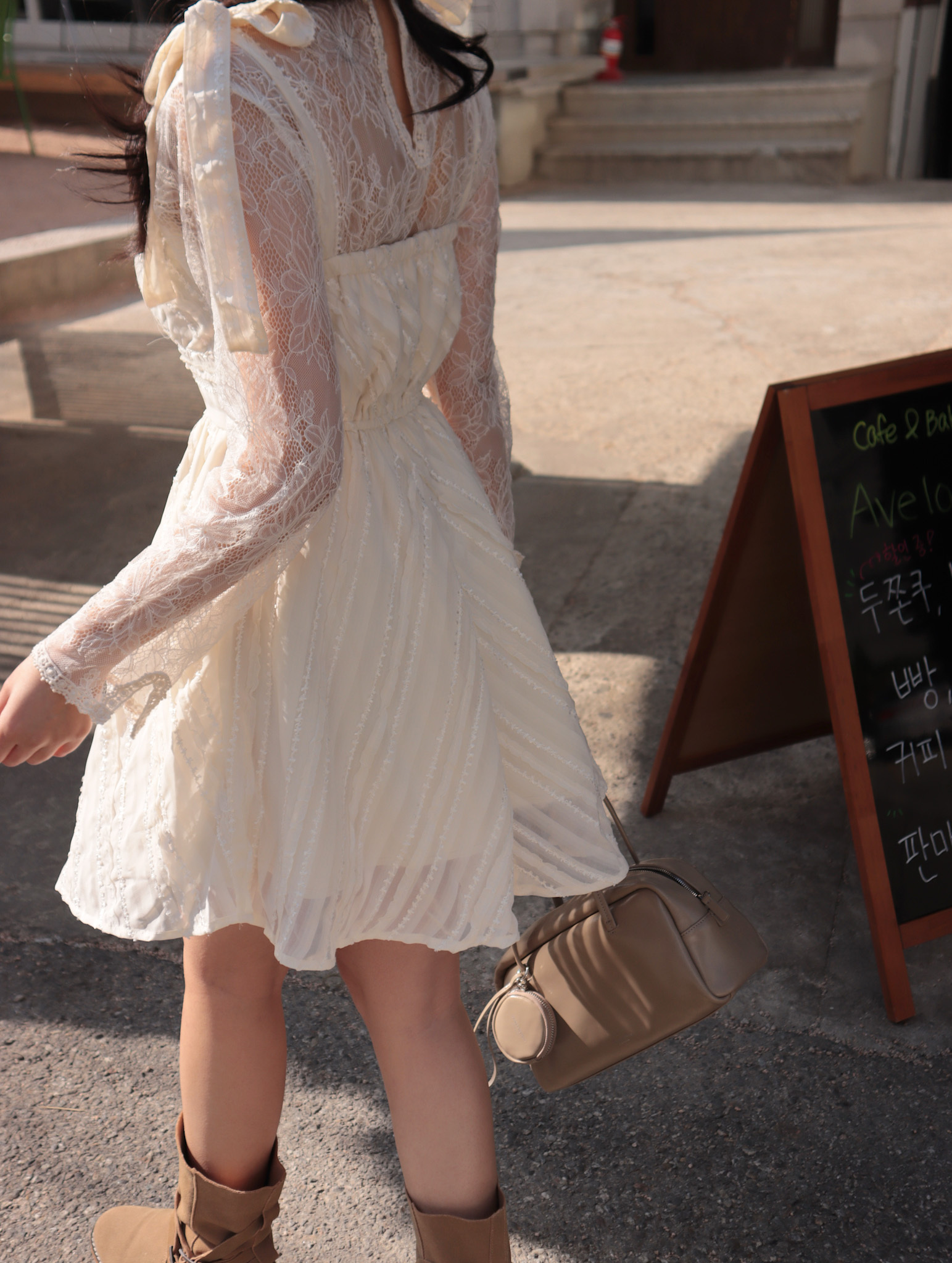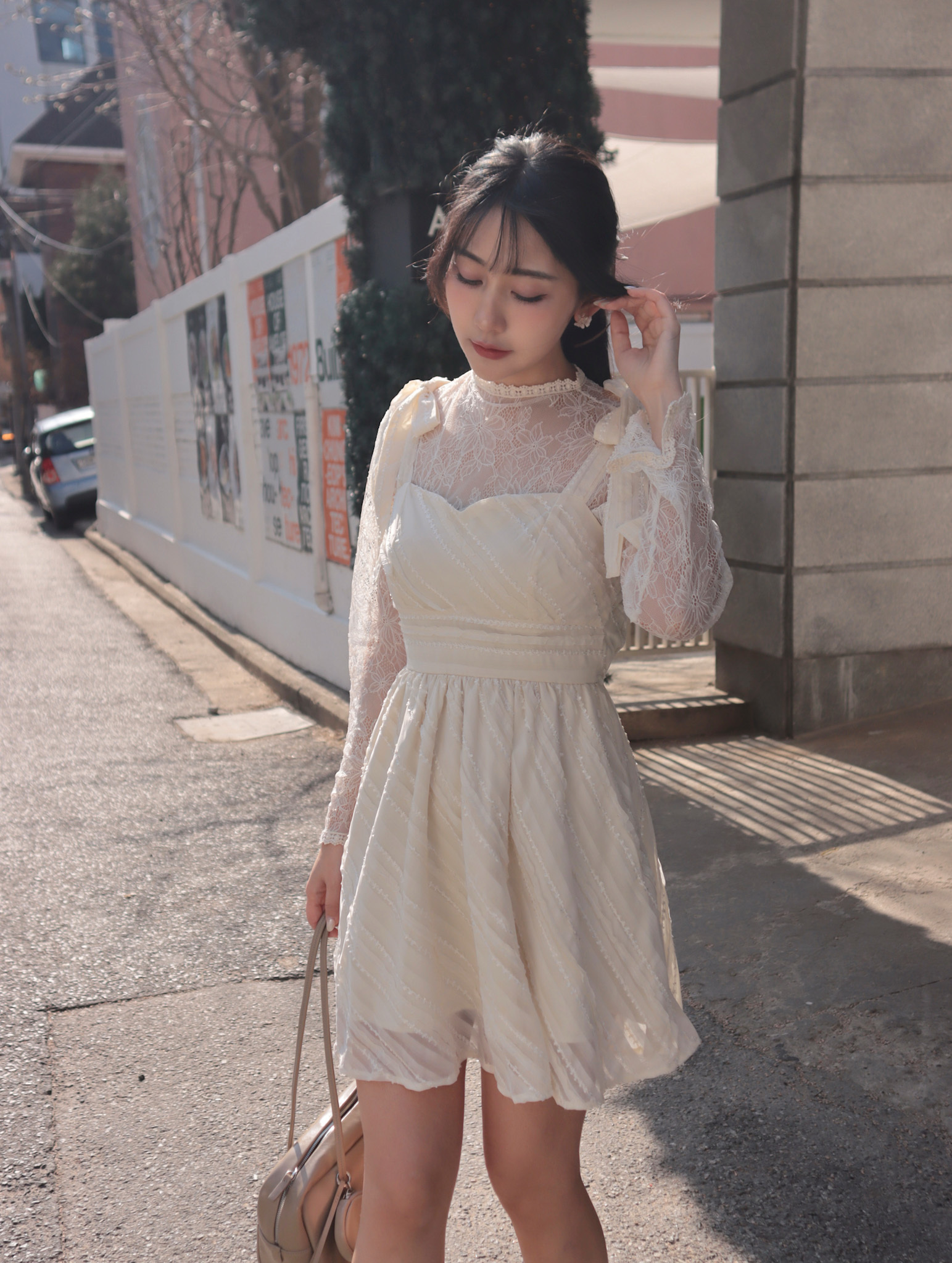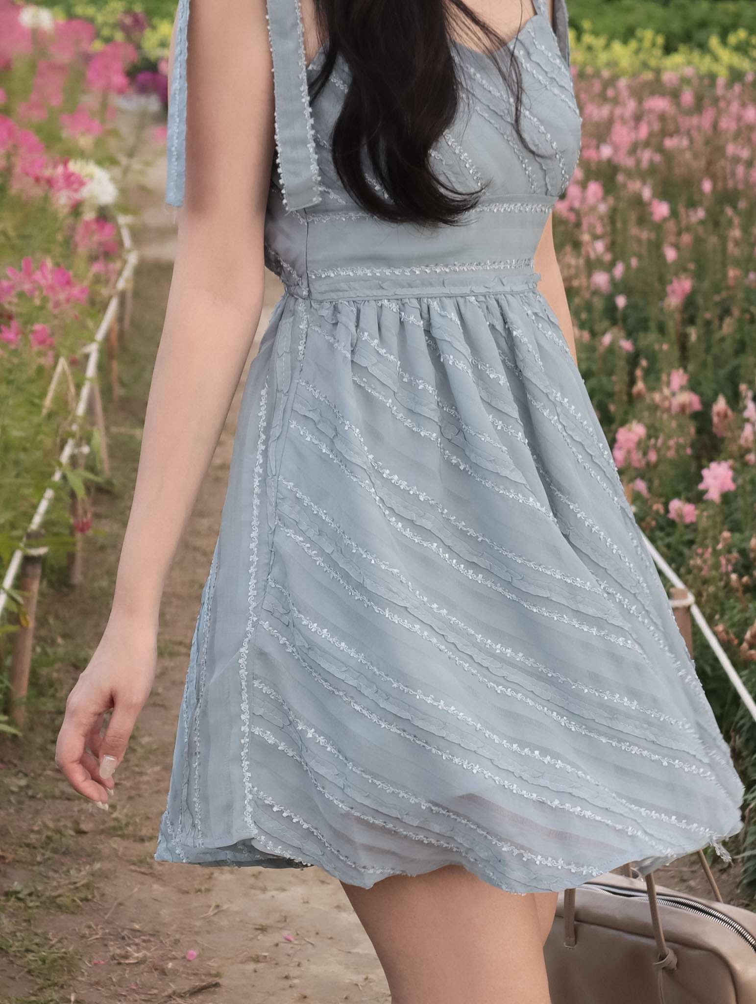 26B204 布拉格假期_肩膀蝴蝶結蕾絲紋雪紡縮腰顯瘦小洋裝/短洋