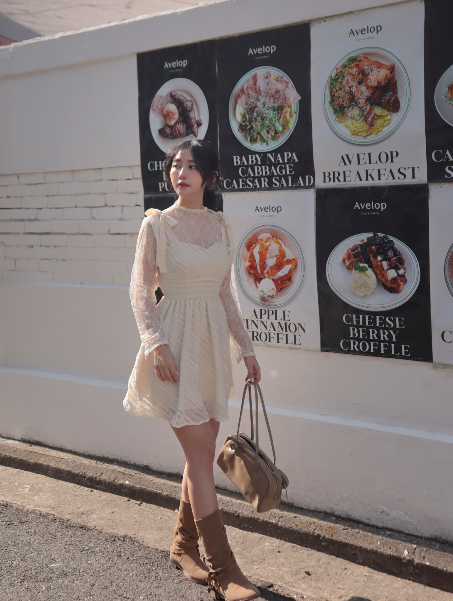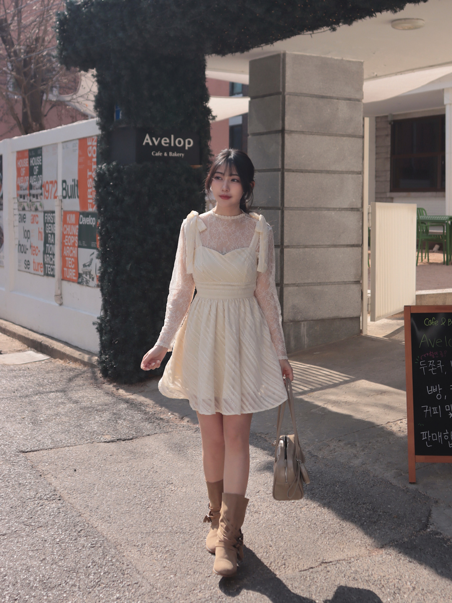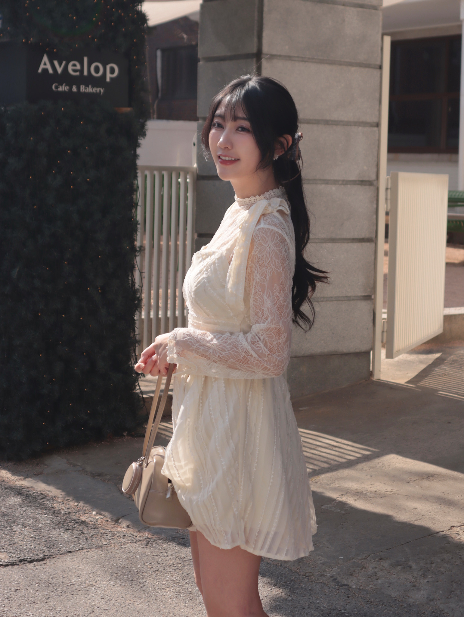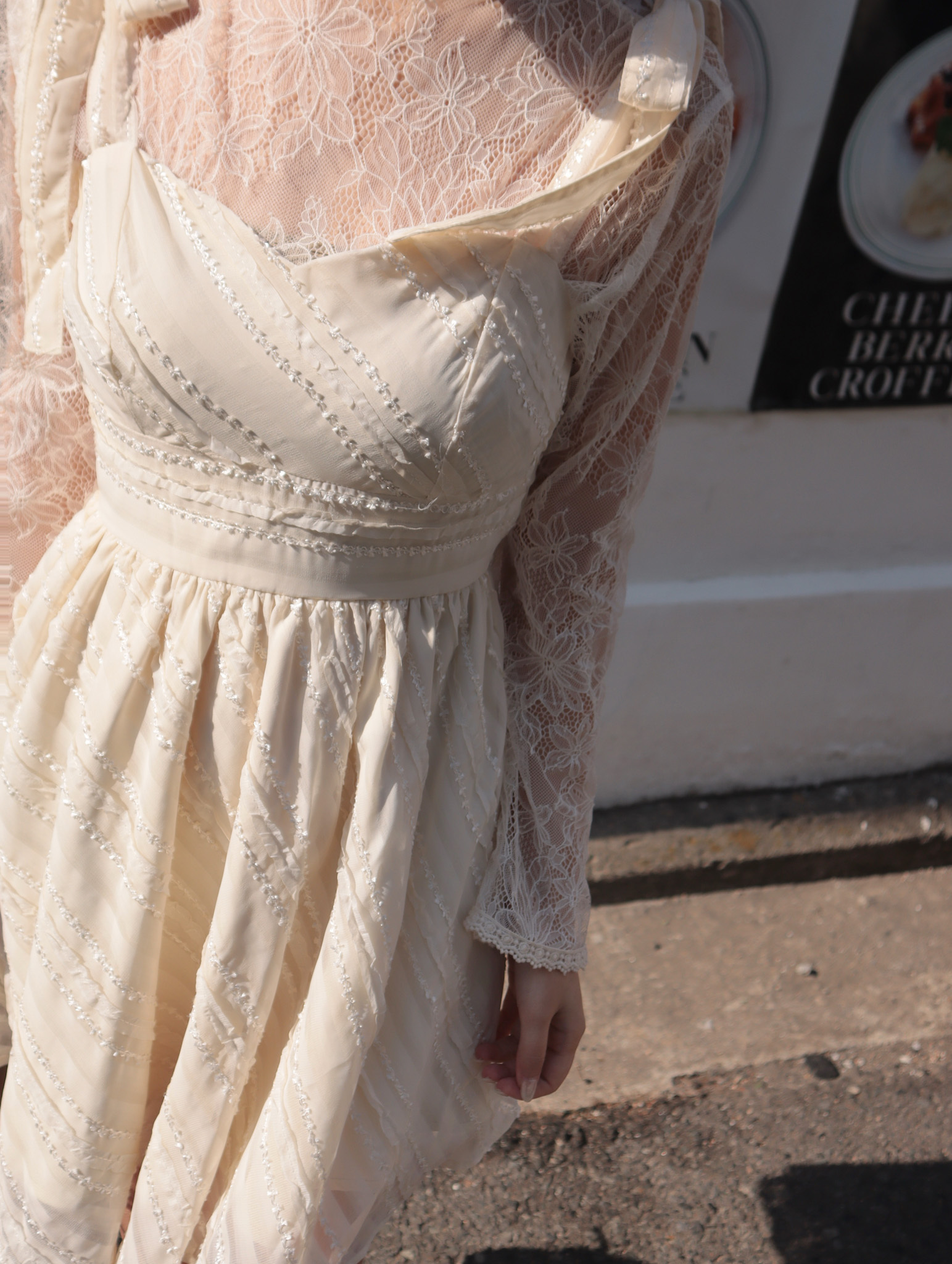 26B204 布拉格假期_肩膀蝴蝶結蕾絲紋雪紡縮腰顯瘦小洋裝/短洋
